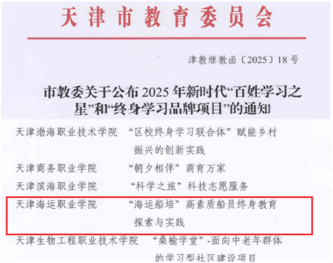 习近平总书记在2024年全国教育大会上强调,“深入实施国家教育数字化战略,扩大优质教育资源受益面,提升终身学习公共服务水平”,对学习型社会建设作出系统部署。2025年1月,中共中央、国务院印发的《教育强国建设规划纲要(2024—2035年)》把全面构建泛在可及的终身教育体系作为一项重要目标。近日,天津海运职业学院凭借“海运船培——高素质船员终身教育探索与实践”项目,成功入选2025年天津市“终身学习品牌项目”。此次获评彰显了学院在服务国家海洋强国战略、推动航运业人才培养模式创新中的示范引领作用。