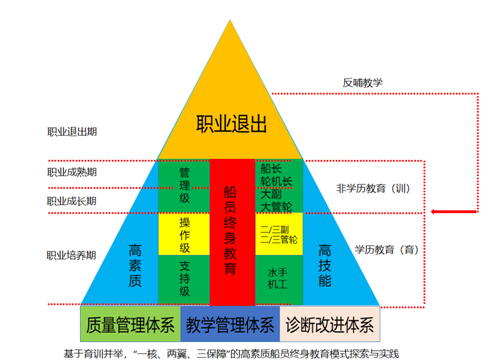 在市教委统筹指导下,学院党委高度重视新时代终身教育体系建设,锚定“服务行业需求、赋能人才发展”目标,由继续教育中心牵头整合资源,联合航海技术系等教学系部,协同多家头部航运企业,构建了覆盖海员全职业生命周期的“一核两翼三保障”终身教育模式。“一核”即以船员终身教育为核心,打破传统职业教育边界,贯穿职业准入、技能提升、岗位转型全链条;“两翼”聚焦“高素质”与“高技能”双轮驱动,通过“全订单培养”(学历教育)与“定制委托培养”(非学历教育)深度融合,精准对接国际航运产业升级需求;“三保障”依托质量管理体系、产教协同教学管理体系及动态诊断改进体系,形成标准化、数字化、闭环化的教育质量保障体系,近两年,累计为行业输送超3000余名复合型船员,企业满意度持续提升,毕业生就业率稳居全国同类院校前列。
